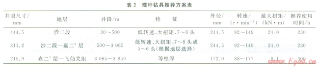鉆井提速技術(shù)已經(jīng)廣泛應(yīng)用PDC鉆頭+螺桿鉆具的復(fù)合鉆井模式[2],螺桿的使用增加了井底鉆頭轉(zhuǎn)速從而大幅提高鉆井速度。但常規(guī)螺桿鉆具在大尺寸井段的扭矩不足,隨著井底溫度升高也會對螺桿定子橡膠產(chǎn)生影響[5-6],通過對不同井眼尺寸的螺桿鉆具應(yīng)用試驗(yàn)效果進(jìn)行分析,推薦了螺桿鉆具應(yīng)用的參數(shù)要求(表2),從而更好地與PDC鉆頭使用時(shí)間匹配: