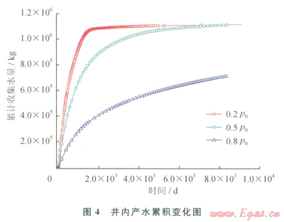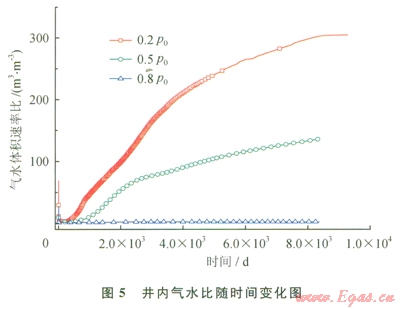 從上述研究成果町以得出,在0.2p0條件下,水合物藏中水合物全部分解,井內(nèi)收集到3.4×105m3的氣體。圖4為0.2p0、42℃,0.5p0、42℃,0.8p0、42℃這3種條件下,井內(nèi)收集水的累積變化圖。從圖4中可以看出,產(chǎn)水集中在開采前期1500d,后期產(chǎn)水速率小。在0.5p0、42℃,0.8p0、42℃條件下,也有較大量的水被收集,表明也有較大量的水合物被分解了。圖5為整個開采過程中3種條件下,井內(nèi)氣水比隨時間的變化圖。從圖5可以看出,0.2p0、42℃條件下,氣水比一直在增加,最大值達到304;而0.5p0、42℃條件下,氣水比增加緩慢,最大達到136;0.8p0、42℃條件下氣水體積比一直接近0,開采后期也沒有改善??梢钥闯?,在井內(nèi)壓力高時,井和物藏間的壓差不夠大,整個開采過程,分解后的自由氣并沒有大量流人開采井內(nèi)??梢姕p壓驅(qū)動力對于分解后自由氣在井內(nèi)的收集非常重要。物藏和井之間壓差太小,自由氣一直留在物藏內(nèi),無法在井內(nèi)被收集。