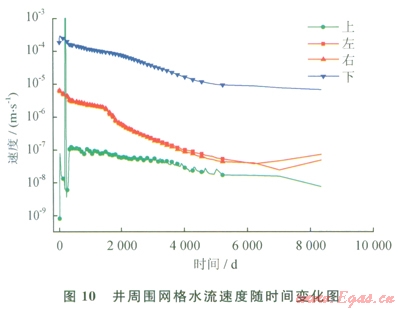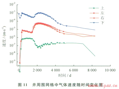孔隙滲透換熱能夠?qū)⒛芰總魅宋锊?。圖l0為井周圍網(wǎng)格水流速度隨時間的變化圖。左、右和下表示網(wǎng)格中水流向井內(nèi),而上則表示井從上流入其正下方網(wǎng)格。圖10中下表示正上方網(wǎng)格流人下方井內(nèi)水流速率,也就是圖10中“下”表示的曲線,該速率遠高于其他3個方向的速率。圖ll為井周圍網(wǎng)格中氣體速率隨時間變化圖。同樣是上方網(wǎng)格流向正下方井內(nèi)氣體速率最大,也就是圖ll中“下”表示的曲線。氣流和水流的速率數(shù)量級均為l04m/s。由于甲烷氣導(dǎo)熱系數(shù)約為0.03W/(m·K),遠低于液態(tài)水的導(dǎo)熱系數(shù),其換熱可以不計算,這里只計算水的對流。