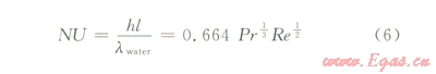 式中NU表示努賽爾數(shù);h表示換熱系數(shù);l表示特征長度0.33m,4倍面積除以潤周得到特征長度;lwater表示水的有效導(dǎo)熱系數(shù),0.12W/(m·K);Pr表示普朗特數(shù),取飽和水40℃時的值;Re表示雷洛數(shù)。