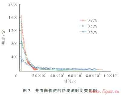 從圖9中可以看出,8500d內(nèi),井和周圍網(wǎng)格溫差平均值為30.3℃。因為左右網(wǎng)格中心和井網(wǎng)購中心距離大,井對左、右網(wǎng)格的導(dǎo)熱熱流忽略不計。只考慮上、下網(wǎng)格,導(dǎo)熱距離0.35m。骨架有效導(dǎo)熱系數(shù)為1.86W/(m·K),水的有效導(dǎo)熱系數(shù)為0.12W/(m·K)。由式(4),骨架導(dǎo)熱功率64.4W,水導(dǎo)熱功率4.1W,所以總的導(dǎo)熱熱流為68.5W。