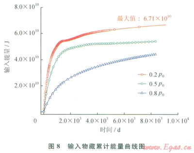 用80m×400m×1m水合物藏開采模擬所得數(shù)據(jù),結(jié)合開采物藏和井的參數(shù),可計算減壓和加熱對水合物分解的貢獻。水合物藏中水合物總質(zhì)量為3.6×106kg。由式(2)可得,完全通過加熱熔化需要能量1.27×1012J。圖7為井流向物藏的熱流隨時間變化圖。對圖7熱流進行積分,得到輸入物藏累計能量變化曲線(圖8)。在0.2P0、42℃條件下,輸人物藏的能量最大,為6.71×1010J。井內(nèi)溫壓條件為0.5P0、42℃時,輸入物藏的能量為5.39×1010J,0.8P0、42℃時,輸人物藏能量為4.39×1010J。由式(1)可得,在0.2P、42℃條件下,加熱分解了5.28%的水合物,其余的水合物由減壓驅(qū)動力所分解。而在另外兩種井內(nèi)溫度壓力條件下,加熱分解的水合物量多一些,而減壓所分解的水合物量相比更少一些。