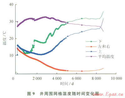 流入井內(nèi)的熱流可以通過手動計算得到印證。下面只對0.2P0、42℃條件下數(shù)據(jù)進行計算。圖9為0.2P0、42℃條件下,井周圍網(wǎng)格溫度隨時間變化圖。井網(wǎng)格和其相連4個網(wǎng)格間溫度差及其平均值都列于圖9中,井溫度為定值42℃,平均溫差由如下式定義: