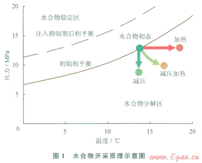 井的高溫和低壓條件將促使水合物分解。同時,多孔介質(zhì)中的水合物的分解將提高物藏的流動性,進而促進降壓和加熱驅(qū)動力分解水合物的效果,使得水合物藏進一步分解,從而形成良性循環(huán)。這樣將使更多的水合物分解,最終達到開采目的。