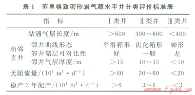 根據(jù)蘇里格致密砂巖氣藏現(xiàn)有的200多口水平井資料統(tǒng)計,水平井的試氣無阻流量主要在40×l04/m3/d以上,試氣產(chǎn)量主要在6×104m3/d以上。但部分井的修正等時試井數(shù)據(jù)分析Ⅲ1表明:由于測試時間較短,低滲砂巖氣藏氣井的壓力傳導范圍有限。因此,水平井試氣計算的無阻流量普遍偏高較多,與試井計算的無阻流量相比,相對誤差在15%~60%。由于通過測井等靜態(tài)資料,無法獲取水平井鉆遇有效儲層的垂向厚度參數(shù),加上試氣無阻流量的誤差較大。因此,致密氣藏水平井的分類應綜合多方面的因素。在對蘇里格氣田l90 口水平井地質分析和產(chǎn)能評價的基礎上(圖1),初步提出了蘇里格致密砂巖氣藏水平井的分類評價標準(表1)。