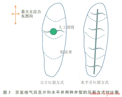 蘇里格氣田直井開發(fā)方式下采收率較低,除了井網(wǎng)控制程度的影響外,阻流帶造成鉆遇砂體動用不完善也是主要原因之一,而水平井可以克服“阻流帶”的影響,再通過多段壓裂,可有效提高鉆遇儲層的動用程度(圖3)。
