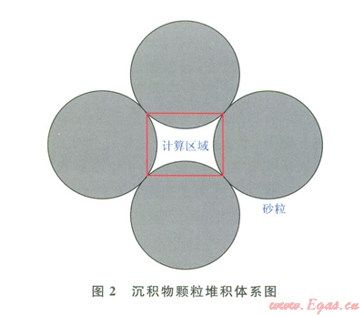 由于沉積物孔隙內(nèi)水合物實際生成過程比較復(fù)雜,因而模型對物理過程進行了簡化,假定所有沉積物顆粒都為正網(wǎng)形且粒徑分布均一,沉積物體系內(nèi)各向同性。自然界中,沉積物層位于海底,由于海水和沉積層的壓力,沉積物顆粒被壓實,孔隙水充填于沉積物孔隙內(nèi)部,氣體溶解于填充的孔隙水中。沉積物顆粒間彼此錯落排列,形成沉積物間孔隙的是顆粒的圓弧面,計算區(qū)域的邊界為沉積物顆粒的弦長,如圖2所示。邊界條件采用反彈邊界。