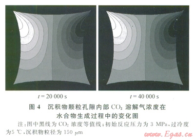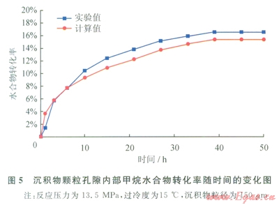 首先,實驗采用的沉積物并非是孔徑為150mm的均一顆粒,而是介于l50~250mm的區(qū)間,因此,形成的顆粒間的孔隙尺寸也就不統(tǒng)一,孔隙尺寸分布呈一定區(qū)間,對孔隙空間內(nèi)水合物生成過程的影響也就不盡相同,而模型模擬的是沉積物粒徑為l50mm的孔隙空間,孔隙尺寸是恒定的。其次,實際實驗過程中,氣體與沉積物體系的交界面處最容易生成水合物,同時,界面處的水合物容易通過毛細作用將沉積物體系內(nèi)孔隙水運移到水合物周圍,而水合物生成區(qū)域的擴散傳遞作用是最強烈的。氣體的擴散時刻都在發(fā)生,可能直接擴散進入沉積物孔隙水里,也可能直接擴散進入水合物中,生成水合物,而模型的假設(shè)是氣體必須首先擴散進入沉積物孔隙水中,再從孔隙水中通過水合物膜表面擴散生成水合物。因此,綜合考慮,模擬結(jié)果與實驗結(jié)果存在一定的偏差,但誤差比較小,誤差范圍為3%~7%,模型結(jié)果基本可靠。