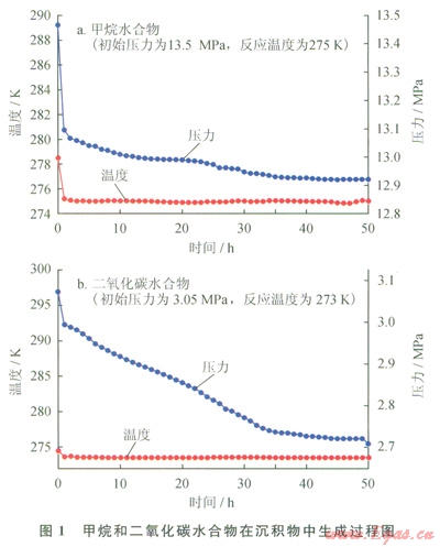 在進行數(shù)值模擬之前,對甲烷和二氧化碳氣體水合物的生成過程先進行了實驗室模擬,實驗?zāi)M裝置主要由管路、氣瓶、增壓裝置、真空泵、恒溫水浴和反應(yīng)釜組成,具體見本文參考文獻[12]。沉積物樣品選用南海淺表層沉積物,人工進行清洗并干燥,后進行篩分,按照一定的粒徑進行分類。本次實驗粒徑分布介于60~100目的沉積物,測得其孔隙度為36.7%。甲烷水合物和二氧化碳水合物生成過程分別在不同的溫度和壓力條件下進行,觀測水合物生成過程中體系內(nèi)溫度和壓力的變化。實驗結(jié)果如圖1所示。
