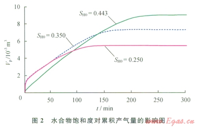 水合物的飽和度(SHO)指儲(chǔ)層孔隙中水合物含量占沉積物孔隙總體積的比例,是表征水合物藏中水合物聚集程度的量度。在其他儲(chǔ)層特征相同的條件下,當(dāng)水合物飽和度較高,即系統(tǒng)中水合物含量越高時(shí),水合物分解會(huì)產(chǎn)生更多的氣體,但同相水合物的存在降低了儲(chǔ)層的流體疏導(dǎo)能力,影響壓力傳遞效果。如圖2所示[28],在初始階段,水合物飽和度越高時(shí),累積產(chǎn)氣量(Vp)反而較低,但到后期,隨著壓力的傳遞,水合物分解和累積產(chǎn)氣量都會(huì)提高。因此,從長(zhǎng)時(shí)間來(lái)說(shuō),高飽和度有利于提高產(chǎn)氣潛力。