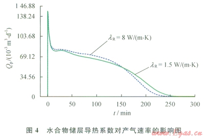 導(dǎo)熱系數(shù)是指水合物儲(chǔ)層傳播熱量的能力。水合物分解是一個(gè)吸熱過(guò)程,對(duì)于水合物地層,若其導(dǎo)熱系數(shù)大,則在單位時(shí)間多孔介質(zhì)中有更多的熱量傳遞到水合物分解前緣,對(duì)水合物分解有更好的促進(jìn)作用。圖4顯示了地層導(dǎo)熱系數(shù)(lR)分別為1.5 W/(m·K)和8W/(m·K)條件下水合物藏產(chǎn)氣速率隨時(shí)間變化的關(guān)系[28]。可以發(fā)現(xiàn),在其他參數(shù)相同的條件下,在開(kāi)采的前期,隨著地層導(dǎo)熱系數(shù)的增加,水合物產(chǎn)氣速率增加;開(kāi)采后期隨著地層導(dǎo)熱系數(shù)的增加,水合物產(chǎn)氣速率反而減小,但導(dǎo)熱系數(shù)對(duì)水合物藏產(chǎn)氣速率的總體影響很小。
