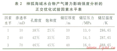 水合物藏產(chǎn)氣潛力的地質(zhì)評(píng)價(jià)參數(shù)是指對(duì)水合物產(chǎn)氣效率產(chǎn)生影響的沉積地質(zhì)要素,地質(zhì)評(píng)價(jià)參數(shù)的正確選擇是產(chǎn)氣潛力評(píng)價(jià)的關(guān)鍵。首先,通過(guò)綜合特定海域水合物區(qū)的地質(zhì)、地球物理、鉆探數(shù)據(jù)等資料,研究巖性、巖相展布規(guī)律、水合物的賦存狀態(tài)和地質(zhì)條件、水合物產(chǎn)m特征和儲(chǔ)層類(lèi)型,定性和定量分析影響水合物分解和產(chǎn)氣潛力的各項(xiàng)要素,如巖性、溫壓條件、沉積體孔隙度、水合物飽和度、滲透率、儲(chǔ)層厚度、孔隙水鹽度等;然后,數(shù)值分析地質(zhì)參數(shù)對(duì)水合物產(chǎn)能的影響強(qiáng)度和敏感性,利用正交優(yōu)化試驗(yàn)方法對(duì)地質(zhì)參數(shù)的影響強(qiáng)度進(jìn)行排序,如表l中南海北部神狐海域3個(gè)站位上的水合物產(chǎn)出特征的地質(zhì)參數(shù),可構(gòu)建如表2所示的正交優(yōu)化試驗(yàn)因素水平表,通過(guò)選用合適的正交表即可實(shí)現(xiàn)對(duì)地質(zhì)參數(shù)的優(yōu)化和排序;選擇對(duì)水合物藏產(chǎn)氣潛力影響較為顯著的地質(zhì)參數(shù),舍棄影響較小、敏感性差的地質(zhì)參數(shù)。