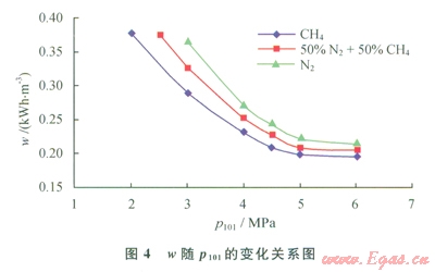 當(dāng)LNG儲(chǔ)存壓力(P104)為2MPa、氣體制冷劑膨脹前壓力(P204)為5MPa、氣體制冷劑膨脹前預(yù)冷溫度(t206)為-30℃時(shí),在一定范圍內(nèi)改變進(jìn)口天然氣壓力(P101),通過HYSYS軟件模擬計(jì)算可得到產(chǎn)品LNG的單位能耗(w),進(jìn)而得到w隨P101的變化關(guān)系(圖4)。由南圖4可知,產(chǎn)品LNG單位能耗隨進(jìn)口天然氣壓力的增加而降低。這是因?yàn)閴毫υ礁?,換熱器的平均換熱溫差越小,因而能耗越低。由于進(jìn)口天然氣壓力的升高對(duì)承壓設(shè)備的要求也增加,故而不宜太高。因此,取P101為5MPa作為最優(yōu)進(jìn)口壓力。
