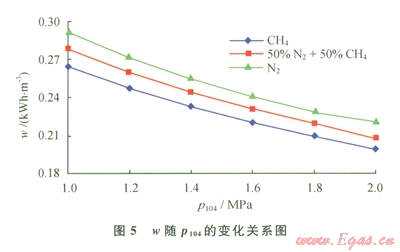當(dāng)進(jìn)口天然氣壓力(P101)為5MPa、氣體制冷劑膨脹前壓力(P204)為5MPa、氣體制冷劑膨脹前預(yù)冷溫度(t206)為-30℃時(shí),在一定范圍內(nèi)改變LNG儲(chǔ)存壓力(P104),通過HYSYS軟件模擬計(jì)算可得到產(chǎn)品LNG的單位能耗(w),進(jìn)而得到叫隨P104的變化關(guān)系(圖5)。由圖5可知,產(chǎn)品LNG單位能耗隨LNG儲(chǔ)存壓力的增加而降低,這是因?yàn)閮?chǔ)存壓力越高,對(duì)應(yīng)的液化溫度越高,所需的制冷量越少,因而能耗越低。然而儲(chǔ)存壓力的升高對(duì)儲(chǔ)存和輸運(yùn)容器的耐壓要求也增高,增加了運(yùn)輸成本[10]。取P104為2MPa作為最優(yōu)的LNG儲(chǔ)存壓力。