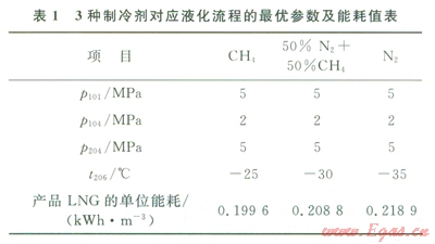 通常考慮到安全因素,N2是首選的膨脹制冷劑,為降低能耗,N2-CH4混合物也常被用作制冷劑[7]。通過上述對(duì)CH4、50%N2+50%CH4和N2這3種制冷劑的研究,可得到3種對(duì)應(yīng)液化流程的最優(yōu)參數(shù)及能耗值(表1)。由表l可知,CH4、50%N2+50%CH4和N2這3種制冷劑膨脹前預(yù)冷溫度的最優(yōu)值依次降低,這是由于N2的液化溫度低于CH4的液化溫度而造成的。由圖5及表l不難發(fā)現(xiàn)這3種制冷劑中N2的能耗最高,CH4的能耗最低,這是因?yàn)檫M(jìn)口天然氣的比熱容隨溫度變化的性質(zhì)與CH4制冷劑的比熱容隨溫度變化的性質(zhì)十分接近[11],使得天然氣與制冷劑換熱時(shí)的平均溫差較小,炯損失較小,能耗也較低。
