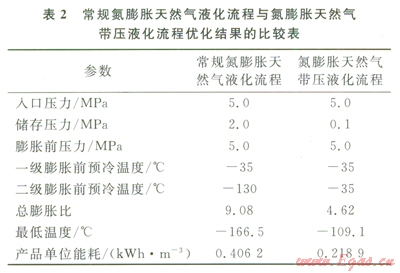 經(jīng)過模擬和優(yōu)化計(jì)算,表2列出了常規(guī)氮膨脹天然氣液化流程和氮膨脹天然氣帶壓液化流程的優(yōu)化結(jié)果。比較可知,二者的最優(yōu)入口壓力、膨脹前壓力和預(yù)冷溫度是相同的。由此可見,和常規(guī)氮膨脹流程相比,氮膨脹天然氣帶壓液化流程具有以下優(yōu)點(diǎn):①膨脹比降低,約為前者的一半;②最低溫度為-l66℃,比前者提高了約56℃;③產(chǎn)品LNG單位能耗僅為0.2189kwh/m3,相較前者的0.4062kwh/m3降低了約46%;④此外,膨脹比的降低使其可以省去一個(gè)壓縮膨脹機(jī)組,使流程結(jié)構(gòu)更簡(jiǎn)單,占地面積更小,并且使流程設(shè)備更少,初投資更低。