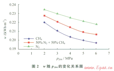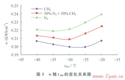 當(dāng)進(jìn)口天然氣壓力(P101)為5MPa、LNG儲(chǔ)存壓力(P104)為2MPa、氣體制冷劑膨脹前壓力(P204)為5MPa時(shí),在一定范圍內(nèi)改變氣體制冷劑膨脹前預(yù)冷溫度(t206),通過HYSYS軟件模擬計(jì)算可得到產(chǎn)品LNG的單位能耗(w),進(jìn)而得到w隨t206的變化關(guān)系(圖3)。由圖3可知,產(chǎn)品LNG單位能耗先隨制冷劑膨脹前預(yù)冷溫度的增加而降低,后又隨之增加而增加。這是因?yàn)榕蛎浨皽囟容^低時(shí),流程的熱負(fù)荷較大,造成制冷劑流量上升,壓縮機(jī)功耗隨之增加,從而導(dǎo)致產(chǎn)品LNG能耗增加。膨脹前溫度較高時(shí),膨脹后的溫度也較高,引起膨脹后壓力自調(diào)節(jié)降低壓力,壓縮機(jī)功耗隨之增加,從而導(dǎo)致產(chǎn)品LNG能耗增加。故而制冷劑存在一個(gè)最優(yōu)膨脹前壓力,南圖3可知,t206為-25℃、-30℃、-35℃時(shí)分別是CH4、50%N2+50%CH4、N2制冷劑的最優(yōu)膨脹前預(yù)冷溫度。