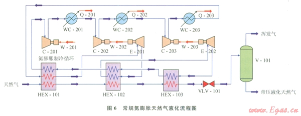 HYSYS模擬的常規(guī)氮膨脹天然氣液化流程如圖6所示[12]。經(jīng)過預(yù)處理后的進(jìn)口天然氣通過換熱器HEX-l01和HEX-l02降溫,然后節(jié)流至l01kPa變?yōu)?span lang="EN-US">LNG,送入儲(chǔ)罐V-101。液化流程所需冷量由氮膨脹制冷循環(huán)提供,由于常規(guī)液化流程所需的低溫更低,若采用單級(jí)膨脹會(huì)導(dǎo)致膨脹機(jī)的膨脹比非常大,故而一般采用兩級(jí)膨脹為流程提供冷量和所需的低溫。氮?dú)庵评鋭┦紫冉?jīng)過三級(jí)壓縮水冷器,再進(jìn)入膨脹機(jī)E-201膨脹降溫,接著進(jìn)入換熱器HEX-102為其提供冷量,然后進(jìn)入膨脹機(jī)E-202繼續(xù)膨脹降溫,接著依次通過三級(jí)換熱器為其提供冷量,最后復(fù)溫回到壓縮機(jī)。其中膨脹機(jī)E-201和E-202產(chǎn)生的膨脹功分別由壓縮機(jī)C-202和C-203完全回收利用,構(gòu)成兩個(gè)壓縮膨脹機(jī)組。由于常規(guī)天然氣液化流程的進(jìn)口天然氣要經(jīng)過CO2預(yù)處理,CO2的含量一般不超過0.01%。因此,這里仍舊取99.99%CH4+0.01%CO2作為進(jìn)口原料氣。