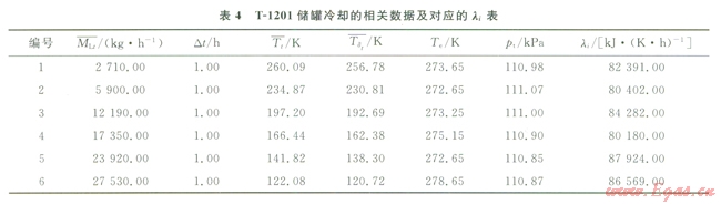 16×104m3常壓全容式混凝土頂儲罐的結(jié)構(gòu)及保溫材料都是相同的,因此,以大連LNG接收站T-1201儲罐冷卻時的數(shù)據(jù)來確定l。l同時也可作為模型的一個修正參數(shù),使所建立的模型更符合冷卻時的實際情況。表4為T-l201儲罐冷卻的相關數(shù)據(jù)及對應的l值。