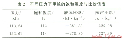 由于LNG的主要成分為甲烷,所以采用純甲烷的物性參數(shù)來確定hL和hBt[14]。而國內(nèi)常壓全容式混凝土頂儲罐的設計壓力一般為-0.50~29.O0kPa(表壓),冷卻時的壓力通常控制在111.32~l21.32kPa(絕對壓力)。表2列出了不同壓力下甲烷的飽和溫度與比焓值,從表2不難看出壓力在l13.24~122.6lkPa時,蒸汽比焓的變化較小,所以取其對應液體比焓的平均值作為hL值,即hL為-280.06kJ/kg。