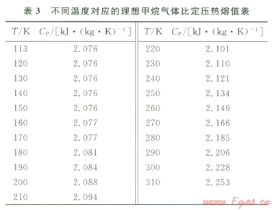 對于hBt的確定,首先通過EPCON Engineer′s Aide Toolbox 7.0軟件查詢出理想甲烷氣體不同溫度時所對應的比定壓熱熔Cp(表3),再運用matlab擬合出Cp與T的關系函數(shù)。