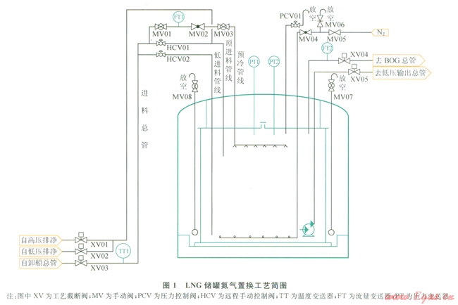 冷卻之前需要對LNG儲罐進行水壓試驗、除水、氣密試驗、干燥和氮氣置換,完成以上步驟之后,儲罐進入備冷狀態(tài)。備冷儲罐在冷卻之前,需要用BOG氣體將罐內(nèi)及環(huán)隙的氮氣置換排放,同時完成進料總管的冷卻和充液。