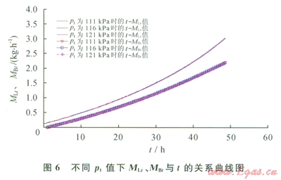 圖6為當環(huán)境溫度為293K、儲罐冷卻初始溫度為273K、冷卻速度為-3.5K/h,儲罐壓力分別為111kPa、116kPa和121kPa時,進入儲罐LNG流量和排出儲罐BOG流量隨時間的變化趨勢。由圖6可知,儲罐壓力的變化對進入儲罐的LNG需求量和BOG排放量影響很小。
