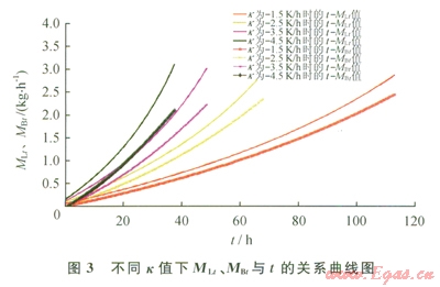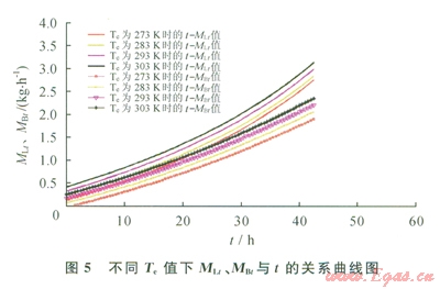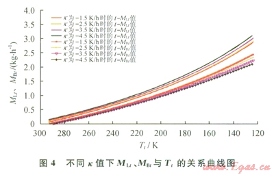 由于冷卻速度不同會導致瞬時進入儲罐的LNG流量和冷卻所需的LNG需求量不同,同時導致瞬時排出儲罐的BOG流量和冷卻過程總共排出的BOG量也不同。當儲罐壓力為111kPa,環(huán)境溫度為293K,儲罐冷卻初始溫度為293K,冷卻速度分別為-1.5K/h、-2.5 K/h、-3.5K/h、-4.5K/h時,冷卻過程中冷卻時間(t)與LNG流量(MLt)、排放BOG流量(MBt)間的關系如圖3所示,冷卻過程中儲罐溫度(Tt)與LNG流量(MLt)、排放BOG流量(MBt)間的關系如圖4所示。