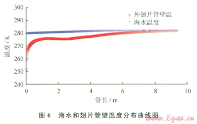 圖6給出了整個(gè)換熱管上翅片管壁和海水的溫度分布曲線。海水流量較之LNG流量大得多,所以其溫度變化不大。在1m以下的位置,管壁的溫度急劇降低,甚至低于冰點(diǎn),很容易導(dǎo)致靠近壁面的海水結(jié)冰。該區(qū)域確實(shí)也是結(jié)冰情況較嚴(yán)重的區(qū)域。