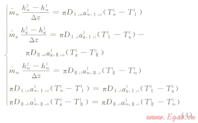 上述3個(gè)能量守恒方程與通過2個(gè)管壁的能量分別相等列出的方程聯(lián)立,可得到下面的方程組: