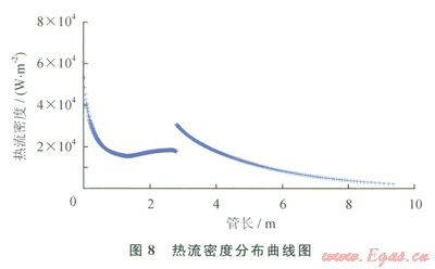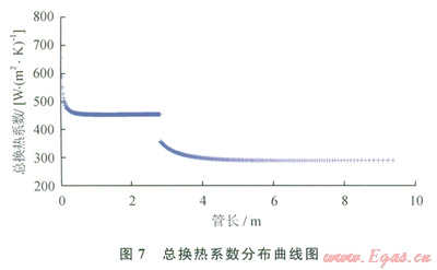 圖7、8分別給出了反映SuperORV整體換熱性能的總換熱系數(shù)和熱流密度的分布曲線。可以看到,在氣化段和加熱段過渡區(qū),2條曲線都出現(xiàn)了跳躍。這是由于SuperORV結(jié)構(gòu)上的變化引起的。圖7中,氣化段的總換熱系數(shù)總體優(yōu)于加熱段的總換熱系數(shù)。圖8中,加熱段開頭的熱流密度先高于氣化段末尾的熱流密度而后逐漸下降,這是由NG流體混合前后的溫度變化引起的,從氣化段出來的2個(gè)流道里的流體混合后導(dǎo)致溫度有大的下降,而后隨著加熱溫度又逐漸上升。