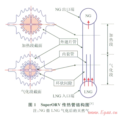 開架式氣化器(ORV)是一種以海水為熱源的氣化器,是液化天然氣(LNG)接收終端中用于基本負(fù)荷的大型氣化裝置,但由于海水容易在該氣化裝置底部結(jié)冰,使得裝置盼傳熱性能下降,導(dǎo)致其氣化性能無法得到進(jìn)一步的提升。超級開架式氣化器(SuperORV)是在ORV基礎(chǔ)上二的改進(jìn)版本,其傳熱管可分為氣化段和加熱段兩部分(圖1)。加熱段中采用雙層結(jié)構(gòu)的傳熱管,使得管外結(jié)冰的狀況得到了進(jìn)有效的改善。據(jù)有關(guān)技術(shù)數(shù)據(jù)[1-2],SuperORV可以使氣化裝置的氣化能力提高3倍,海水流量和安裝空間可分別減小15%和40%。