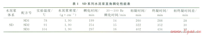 同井形成的水泥環(huán)需要滿足不同氣田的地質(zhì)條件對力學性能及界面膠結性能的要求,各個油氣田做了大量研究試驗工作[10],在該氣田采用了SD系列固井水泥添加劑,該體系使水泥漿具有很好的直角稠化性能,在水泥漿從液態(tài)轉為固態(tài)的過渡階段,地層流體在環(huán)空形成竄流的風險大大降低(圖2、表l)。