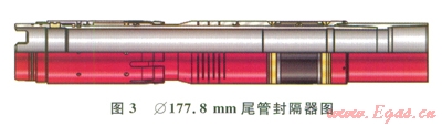 地層易漏和發(fā)生氣竄風險較高的固井施工,采用帶有管外封隔器的固井工具。Æl77.8mm尾管固井施工中,使用帶有管外封隔器的尾管懸掛器(圖3)。頂替水泥漿過程結束后,座封管外封隔器,在Æ177.8mm尾管與上層Æ244.5mm套管之間的環(huán)空實現(xiàn)完全封隔,循環(huán)洗井過程增加的壓力無法傳遞到裸眼段,同時還可阻止地層流體進入封隔器以上的Æ244.5mm套管。