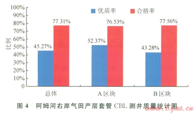 2008年川慶鉆探土庫曼分公司在阿姆河右岸應用上述防氣竄固井技術先期進行了6口井的先導性試驗,提高固井質(zhì)量效果明顯。總結應用試驗結果后,中國石油川慶鉆探工程公司井下作業(yè)公司對固井技術做了進一步優(yōu)化,截止到2011年l2月,在39口井中應用情況良好,CBL測井質(zhì)量優(yōu)質(zhì)率達到45.27%(圖4),合格率達到77.31%,目前該區(qū)塊環(huán)空帶壓情況由2008年之前的40%下降到目前的6%。