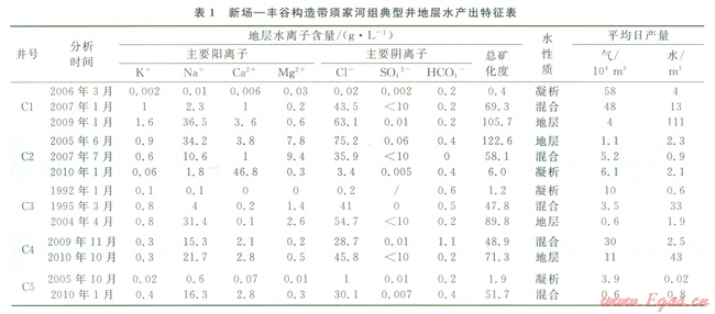 選取該區(qū)須家河組氣藏典型井進(jìn)行生產(chǎn)動(dòng)態(tài)與地層水產(chǎn)出特征綜合分析(表1)。須二段氣藏Cl井生產(chǎn)初期氣產(chǎn)量大于50×104m3/d、水產(chǎn)量小于5m3/d;C3井生產(chǎn)初期氣產(chǎn)量大于l0×104m3/d、水產(chǎn)量小于1m3/d,此時(shí)水分析總礦化度極低,分布在0.094~2.694g/L,產(chǎn)出水為氣藏凝析水;之后氣產(chǎn)量降低,水產(chǎn)量增加,產(chǎn)出水從混合水變?yōu)榈貙铀?span lang="EN-US">C2井情況相反,2007年氣藏未打開(kāi)之前,氣、水產(chǎn)量均不高,產(chǎn)出水礦化度較高,2007年之后儲(chǔ)層改造獲得成功,獲5×104~6×104m3/d的天然氣產(chǎn)能,產(chǎn)出水總礦化度隨著時(shí)間的推移不斷降低,可見(jiàn)地層水中凝析水的混合逐漸增多。