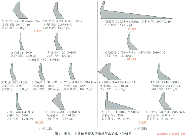 須四段的地層水相圖(圖1)表明地層水分布橫向連通性差,下亞段新場(chǎng)、豐谷地區(qū)各不相同,但各構(gòu)造部位縱向上地層水相圖有一定的相似性。新場(chǎng)地區(qū)XC22井下亞段與X882井上亞段地層水相圖特征相似,豐谷地區(qū)CF563中亞段與CFl75下亞段相岡特征相似。X882井區(qū)斷層發(fā)育,而豐谷地區(qū)斷層不發(fā)育,可見(jiàn)須四段氣水運(yùn)移不僅依靠斷層、裂縫等快速通道,同時(shí)存在垂向運(yùn)移。