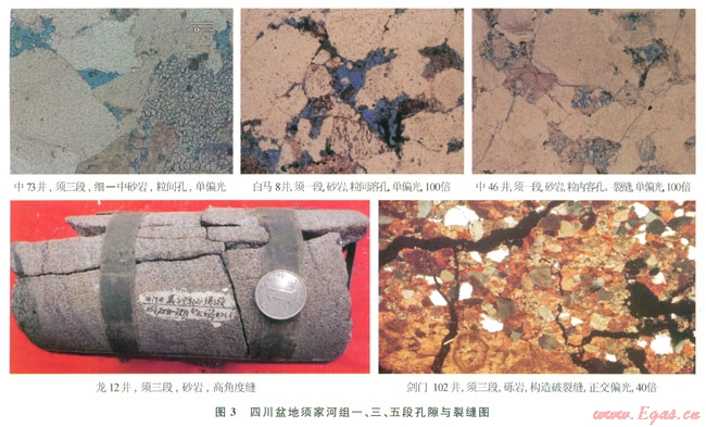 須三段儲集巖有砂巖、礫巖2種類型。砂巖儲層幾乎在全盆地均有分布,儲層孔隙度平均為4.43%,平均滲透率為0.25mD。以中壩地區(qū)物性最好,儲集巖主要為中粒巖屑石英砂巖、長石石英砂巖及巖屑砂巖,巖心平均孔隙度達(dá)7.52%,平均滲透率為0.3mD,粒間溶孔和粒內(nèi)溶孔發(fā)育。礫巖儲層僅分布在川西北劍閣地區(qū),礫石成分以碳酸鹽巖為主,礫間充填砂質(zhì),孔隙主要發(fā)育于基質(zhì)砂巖,孔隙度較低,主要分布在2%~4%。巖心與薄片觀察,裂縫發(fā)育,有時呈組出現(xiàn)或呈網(wǎng)狀,發(fā)育的裂縫溝通了低孔隙度礫巖儲層,改善了儲層的滲透性,孔隙與裂縫組成礫巖儲層儲集空間,形成“有效儲滲體” [15]。目前該區(qū)勘探發(fā)現(xiàn)多口工業(yè)氣井,表明孔隙度為2%~4%的砂礫巖,只要有裂縫的溝通,仍然可以形成有效儲層。平面上,儲層主要分布在川西地區(qū),以川西北劍閣—中壩地區(qū)最為發(fā)育,儲層厚度超過15m。