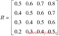 由以上建立的因素層次分析結(jié)構(gòu)圖,結(jié)合專家知識(shí)以及管道數(shù)據(jù),對(duì)各影響因素進(jìn)行兩兩分析,確定模糊一致判斷矩陣。其矩陣如下式所示: