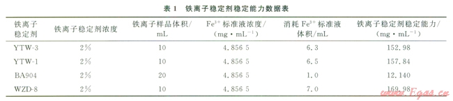 使用鐵離子穩(wěn)定劑的目的是防止酸化后鐵離子形成Fe(OH)3沉淀。評價了4種鐵離子穩(wěn)定劑有效絡(luò)合鐵離子濃度能力吲(表1)。