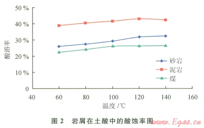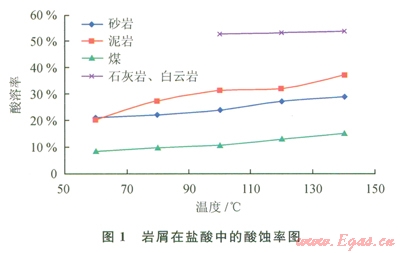 酸液對白云巖、石灰?guī)r的酸化效果最好,酸蝕率超過50%,其次是泥巖;酸液對鉆井液泥餅同樣具有一定的酸溶率,在20%~40%之間。土酸整體的酸化效果優(yōu)于鹽酸,但差距較小。溫度越高,酸化效果越好。因此,在鉆遇易酸化地層時出現(xiàn)卡鉆事故時[2],理論上采用浸泡酸化解卡液的辦法是可行的[3]。
