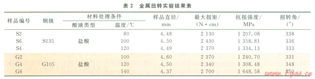 扭轉(zhuǎn)實驗是按照國家標(biāo)準(zhǔn)GB/T l0128-2007金屬室溫扭轉(zhuǎn)試驗方法來執(zhí)行。測試S135鋼和G105鋼在鹽酸基液中被腐蝕一定時間后力學(xué)性質(zhì),即抗扭強(qiáng)度。實驗數(shù)據(jù)見表2所示。