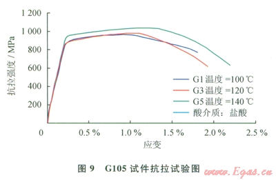 S135鋼、Gl05鋼在拉伸時應(yīng)變試驗見圖8、9,S135鋼在鹽酸中酸化后的抗拉強(qiáng)度均值為l091MPa(鉆桿APl標(biāo)準(zhǔn)要求S135最小抗拉強(qiáng)度為1000MPa);Gl05鋼在鹽酸介質(zhì)中酸化后的抗拉強(qiáng)度均值為994.8MPa(鉆桿API標(biāo)準(zhǔn)要求Gl05最小抗拉強(qiáng)度為793MPa)。因此可以看出,Sl35鋼和Gl05鋼在鹽酸中腐蝕后,抗拉強(qiáng)度仍然能滿足工程需要。