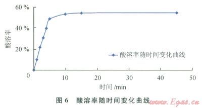 由圖6可知,隨著酸化時間的增加,酸溶率增大,反應(yīng)l0~15min基本結(jié)束,酸溶率可達(dá)到54.72%。因此在現(xiàn)場實際的操作過程中,有效酸化時間超過l5min,即可達(dá)到酸化解卡的效果。