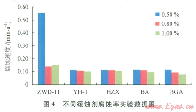 由圖4可以看出,緩蝕劑BGA的緩釋性能最好,加量l.0%時體系的緩蝕率達(dá)到了99.72%(15%鹽酸為基液的空白實驗對金屬的腐蝕速率為27.9276mm/a)。結(jié)合元壩地層的溫度情況,選取BGA為酸化解卡液的緩蝕劑。