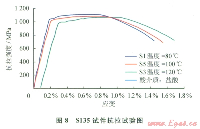 根據(jù)元壩地區(qū)鉆井工程的實際情況,實驗選用了,S135鋼片、Gl05鋼片作為評價對象。一定溫度情況下評價Sl35鋼片、Gl05鋼片在酸化解卡液中腐蝕后強(qiáng)度(抗拉與抗扭)變化情況[12]。