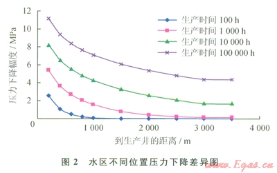 通過(guò)理論計(jì)算能了解水區(qū)不同位置壓力下降幅度的差異。圖2展示的是一個(gè)理論計(jì)算結(jié)果,儲(chǔ)層滲透率為10mD,裂縫發(fā)育帶水侵通道寬度為1000 m,水侵速度為l000m3/a。從圖2可看出,只要觀察井離生產(chǎn)井足夠遠(yuǎn),其井底靜壓力基本能代表水區(qū)平均地層壓力。否則,需要根據(jù)類似于式(5)的計(jì)算模型推算離生產(chǎn)井更遠(yuǎn)處的靜壓力。由于滲透性較好的氣藏開(kāi)發(fā)井距通常都大于lkm,圖2顯示在這種條件下壓差與觀測(cè)點(diǎn)到生產(chǎn)井的距離大體呈線性關(guān)系,近似直線段的斜率與滲透率、水侵速度等相關(guān)。根據(jù)這種認(rèn)識(shí),可基于少量的理論計(jì)算得到近似的經(jīng)驗(yàn)關(guān)系式,在觀察井實(shí)測(cè)靜壓力基礎(chǔ)上作修正,從而獲得更好的代表水區(qū)平均地層壓力的數(shù)據(jù)。