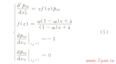 式中z為與滲流數(shù)學(xué)模型無(wú)因次時(shí)間相對(duì)應(yīng)的拉普拉斯空間自變量;`RDF為拉普拉斯空間中儲(chǔ)層裂縫系統(tǒng)無(wú)因次壓力;w為裂縫—孔隙雙重介質(zhì)儲(chǔ)層的儲(chǔ)容比,無(wú)因次;l為裂縫—孔隙雙重介質(zhì)儲(chǔ)層的竄流系數(shù),無(wú)因次;f(z)為綜合描述裂縫系統(tǒng)和孔隙系統(tǒng)儲(chǔ)滲級(jí)差關(guān)系的函數(shù)值,無(wú)因次;xD如為研究單向線性滲流問(wèn)題的一維坐標(biāo)系中無(wú)因次坐標(biāo)值,設(shè)定氣水區(qū)交界處xD=0,水區(qū)外邊界處xD=l。