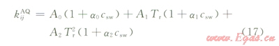 2)對混合規(guī)則作出改進(jìn),非水相和水相分別采用兩套不同的二元交互作用系數(shù)。非水相中的烴水交互作用系數(shù)采用擬合的固定值;水相中的烴—水交互作用系數(shù)(kijAQ)作為烴組分偏心因子(w)、對比溫度(Tr)和礦化度(csw)的函數(shù),即