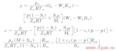 注意到x和y均為壓力的函數(shù),不同壓力下的數(shù)據(jù)點(diǎn)在y—x坐標(biāo)圖中應(yīng)位于同一直線上,直線的斜率即原始烴類孔隙體積。計(jì)算過程中可采用試算法確定部分未知項(xiàng)。包含自由氣與水溶氣的總儲量為: